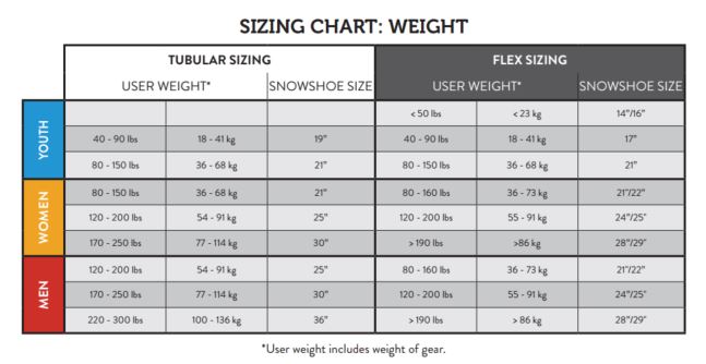 | USER WEIGHT* LBS | USER WEIGHT* KGS | EU SHOE SIZE | SNOWSHOE SIZE |